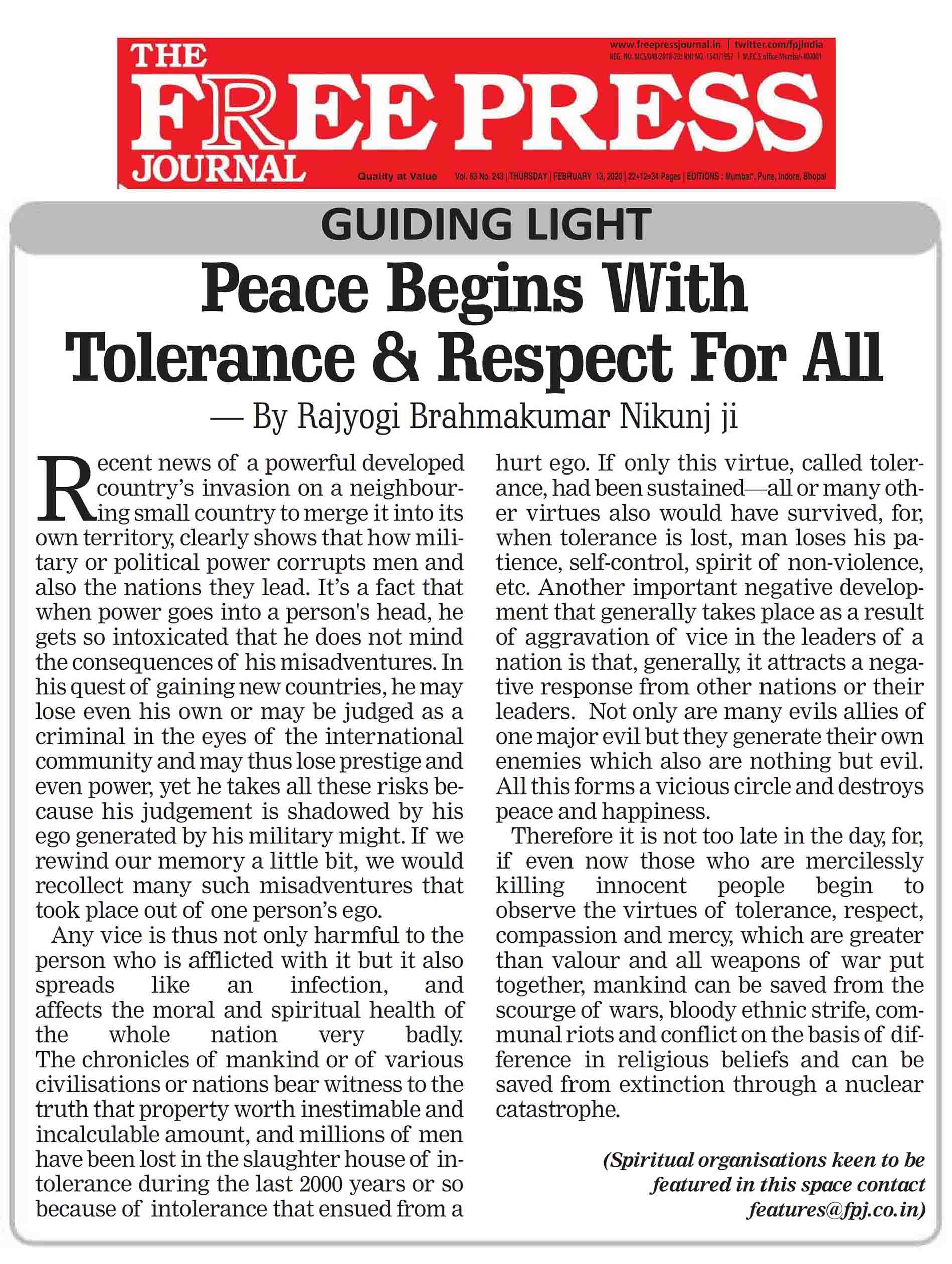 Gallery Peace Begins With Tolerance & Respect For All Rajyogi Nikunj2021-02-08T11:16:36+05:30February 8th, 2021|Read More