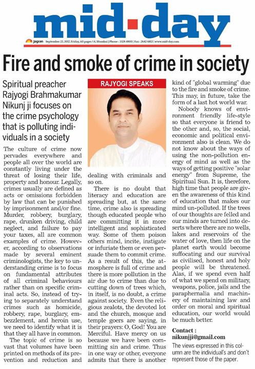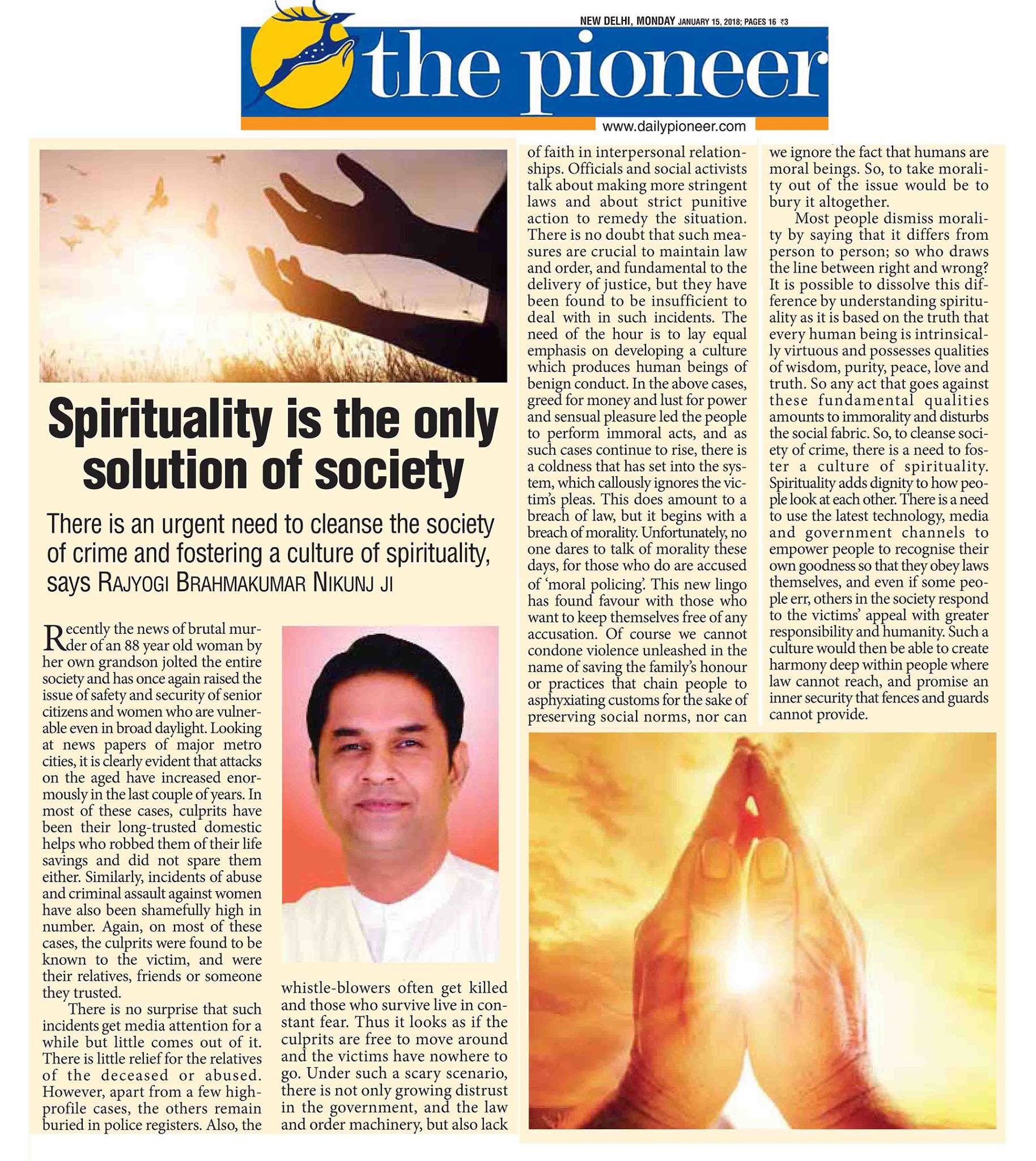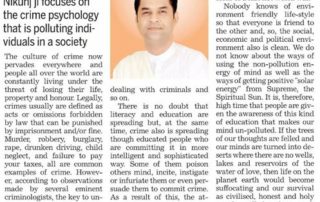 There is an urgent need to cleanse the society of crime and fostering a culture of spirituality. Recently the news of brutal murder of an 88 year old woman by her own grandson