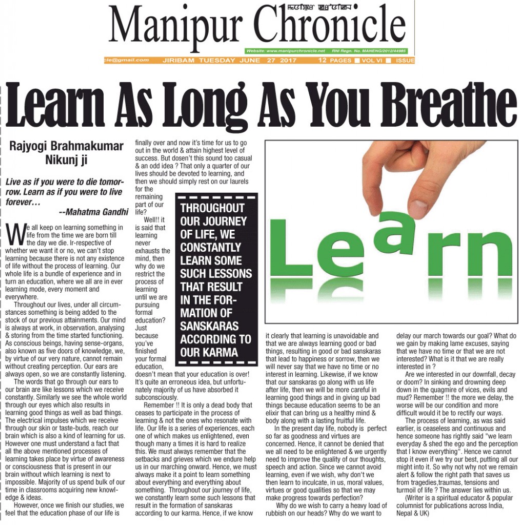 Gallery Learn As Long As You Breathe : Manipur ChronicleRajyogi Nikunj2017-08-28T10:26:43+05:30June 27th, 2017|Read More